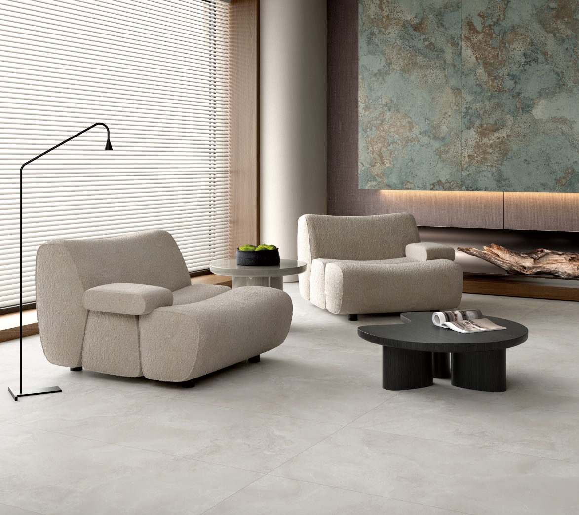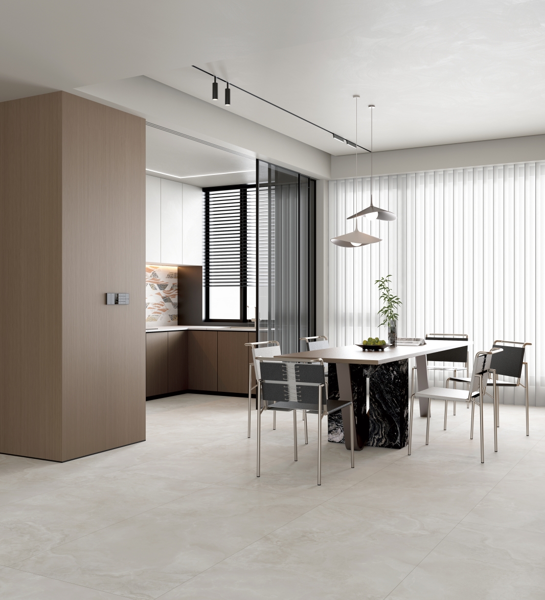 自然通透細(xì)膩,灰色線條、肆意飄散的紋理,深淺變化不一縱情延伸, 在空間里獨(dú)自綻放光彩,營造了獨(dú)特隨性的空間氛圍。
