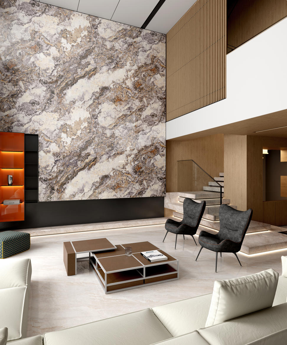 靈感擷取自深海珊瑚的瑰麗形態(tài),將其生命的動態(tài)之美于磚面蔓延綻放。褐、咖、灰、棕交織成獨特藝術(shù)色譜,紋理如珊瑚叢林般自在簇擁,亦如呼吸般自然舒展,蘊藏著深海的生命律動。